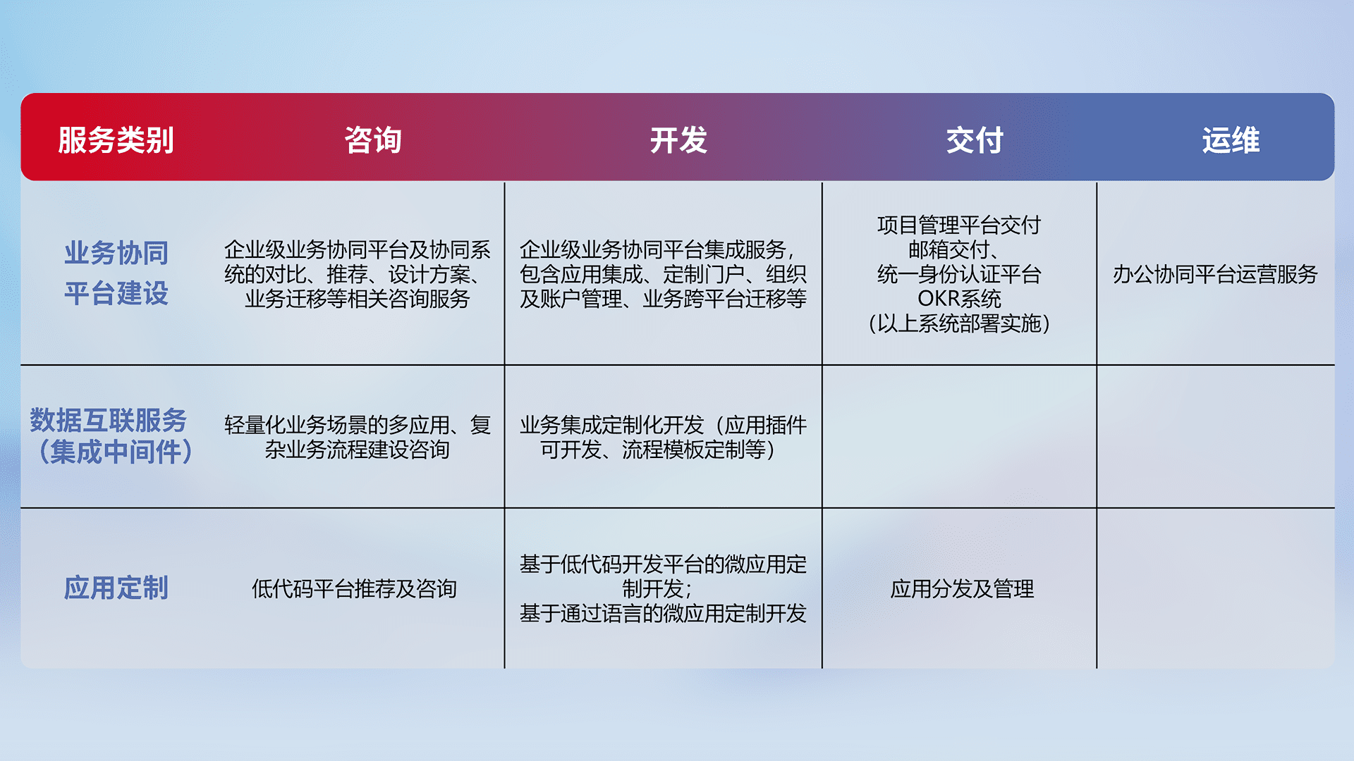 针对钉钉、、、企微、、、IDaas等平台级产品提供产品的规划、、方案、、、、交付、、定制化开发等服务,,,实现如统一协同办公、、智能客户服务、、、、混合会议管理、、、、智能数据查询、、等业务场景,,,实现数字化转型。。。
